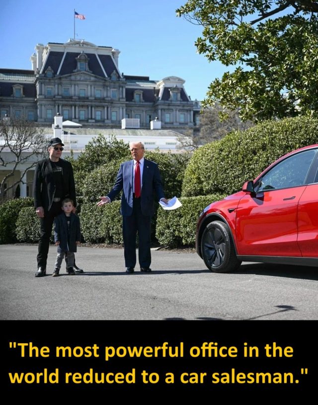 Derulăm acum cele întâmplate recent și ce vedem? Titlu de o șchioapă din “Daily Beast”,  pe 11 martie 2025 ne anunță, în context: “Trump face pe negustorul de mășini pentru firma Tesla, în timp ce averea lui Musk se devalorizează”!
