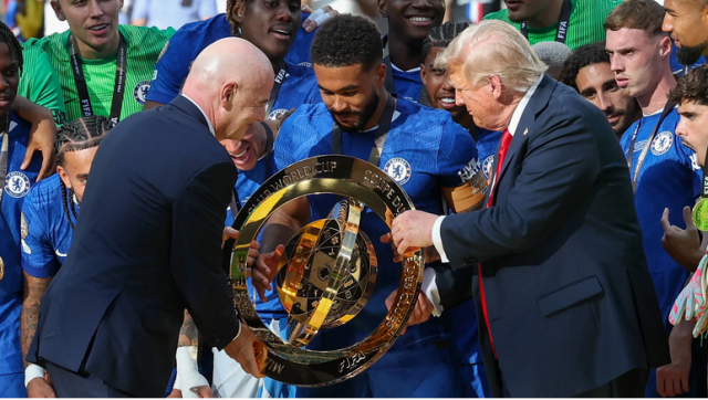 “Președintele Trump a dezvăluit că Chelsea, campioană Mondială a Cluburilor nu va primi trofeul original, deoarece el este cel care îl păstrează. S-a dezvăluit că Trofeul complex, ridicat de căpitanul clubului londonez, Reece James, a fost o replică, deoarece președintele forului de conducere al fotbalului, FIFA, i-a permis lui Trump să folosească originalul ca ornament în Biroul Oval. Trofeul, realizat în colaborare cu Tiffany & Co, prezintă un disc central cu trei inele exterioare rotative. Are un finisaj placat cu aur de 24 de carate și se crede că a costat aproximativ 230.000 de dolari pentru a fi fabricat. Dacă FIFA îi permite lui Trump să păstreze premiul orbital definitiv, este probabil ca acesta să ajungă la Arhivele Naționale.