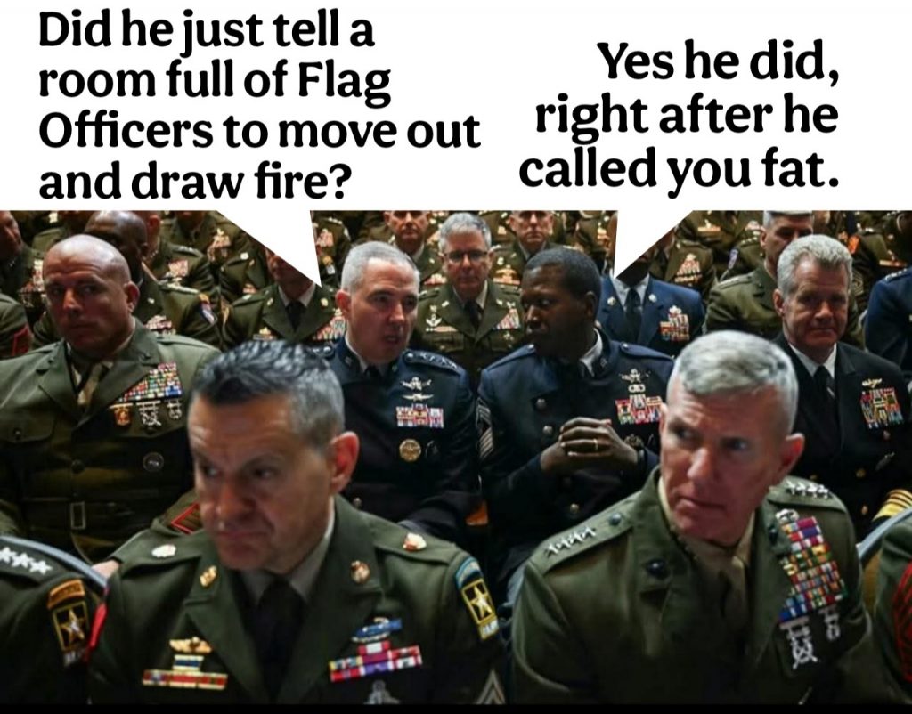 Secretarul de Război…(oare de ce-o fi schimbat Trump denumirea traditională a Departamentului Apărarii în Departamentul de Război, când se laudă că a reușit să pacifice șase conflagrații, fără a-l pune la socoteală și pe Putin, și urmează să instaurze pacea mondială?), Secretarul de Război spuneam, de altfel o persoană fără experiență managerială în domeniul militar, a ținut o cuvântare care i-a nemulțumit pe participanți dar și pe foarte mulți militari americani în rezervă. Adică omul s-a dovedit mai mult un activist-propagandist republican, ce-i drept crescut într-o familie conservatoare tradițională americană, și un ofițer rezervist – când era în lipsă de perspective certe, ce și-a urmat instinctul pecuniar apreciindu-și destul de corect limitele intelectuale și calitățile profesionale în raport cu viața civilă.