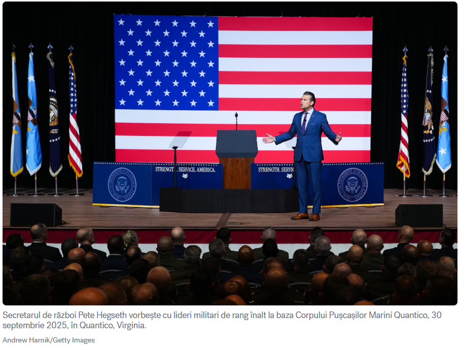 Marți am fost contemporanii unui eveniment cu totul ieșit din comun. Cuplul format din cel de-al 45/47-lea Președinte al Americi, Donald Trump, și al 29-lea Secretar al Departamentului de Război, Peter Hegseth, au mobilizat la Wasington, toți generalii, amiralii și funcționarii superiori ai Forțelor Armate, inclusiv comandanții unităților dislocate în zonele fierbinți din Orientul Mijlociu, Africa, Indochina și zona Pacificului. În total peste 800 așa numiți flag officer.