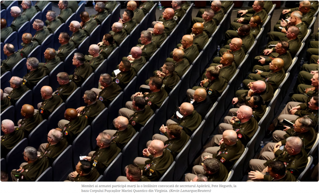 Marți am fost contemporanii unui eveniment cu totul ieșit din comun. Cuplul format din cel de-al 45/47-lea Președinte al Americi, Donald Trump, și al 29-lea Secretar al Departamentului de Război, Peter Hegseth, au mobilizat la Wasington, toți generalii, amiralii și funcționarii superiori ai Forțelor Armate, inclusiv comandanții unităților dislocate în zonele fierbinți din Orientul Mijlociu, Africa, Indochina și zona Pacificului. În total peste 800 așa numiți flag officer.