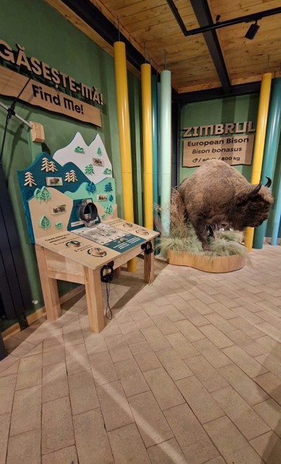 Casa Zimbrului este situată în satul Voinești, din comuna Lerești, județul Argeș aproape de șosea. Arhitectura centrului este inspirată de stilul tradițional al satului de munte, la exterior, proporția clădirii, acoperișul și detaliile ornamentale respectă tradiția zonei. Acoperișul este realizat din șiță prelucrată manual în atelierele din comunitate, panourile fotovoltaice asigură necesara energie verde. Pe un spațiu mai mic de 60 de metri pătrați, provocarea principală a celor ce au gândit Centrul a fost ca vizitatorii să descopere treptat lumea zimbrului. Din acest motiv, în centrul camerei se află o instalație artistică ce sugerează trunchiuri de arbori dintr-o pădure deasă. Această structură limitează accesul vizual direct la întregul conținut expozițional, bazat pe instalații interactive, atractive pentru toate vârstele, astfel încât momentul culminant, întâlnirea cu un exemplar de zimbru în mărime naturală, naturalizat, ascuns în spatele ”trunchiurilor”, să fie o surpriză memorabilă. Etajul este destinat socializării, fiind propice prelegerilor, proiecțiilor și, de ce nu, degustărilor… (foto 8)