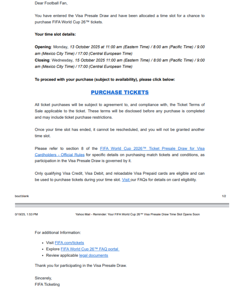 FIFA m-a informat prin email că odată încheiată perioada alocată cumpărării biletelor, de la ora 08.00 pe data de 13 până la 08.00, pe data de 15, nu voi beneficia de un alt interval de timp. Negru pe alb. Deci traficantul de bilete Infantino amenință, printre rânduri: “Ori cumperi acum ori te pupăm și pa, saracule!”
