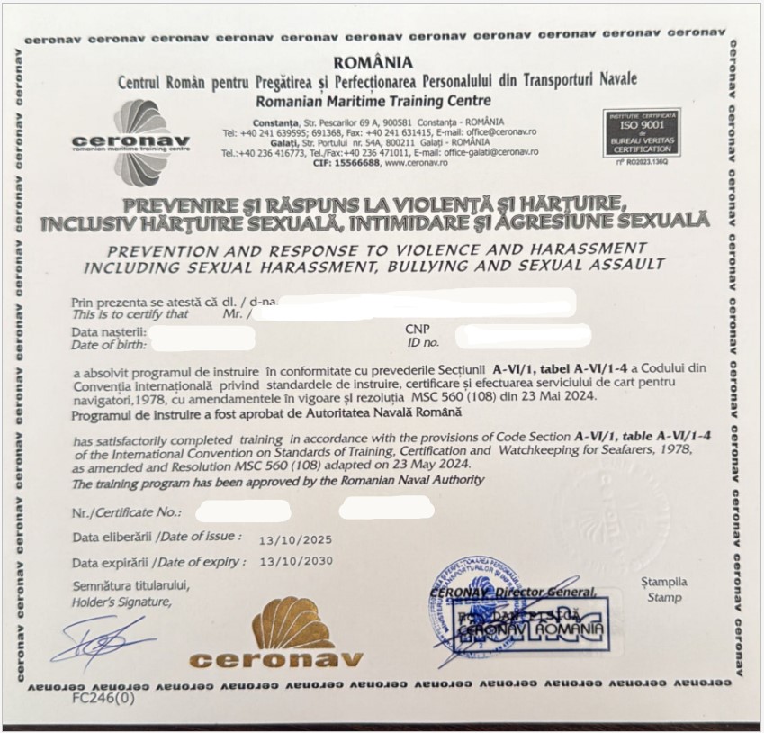 Începând cu 1 ianuarie 2026, conform circularii emise de CERONAV, toți deținătorii unui certificat valabil de Basic Training vor fi obligați să urmeze un curs suplimentar privind prevenirea și răspunsul la cazuri de violență și hărțuire la bord.
