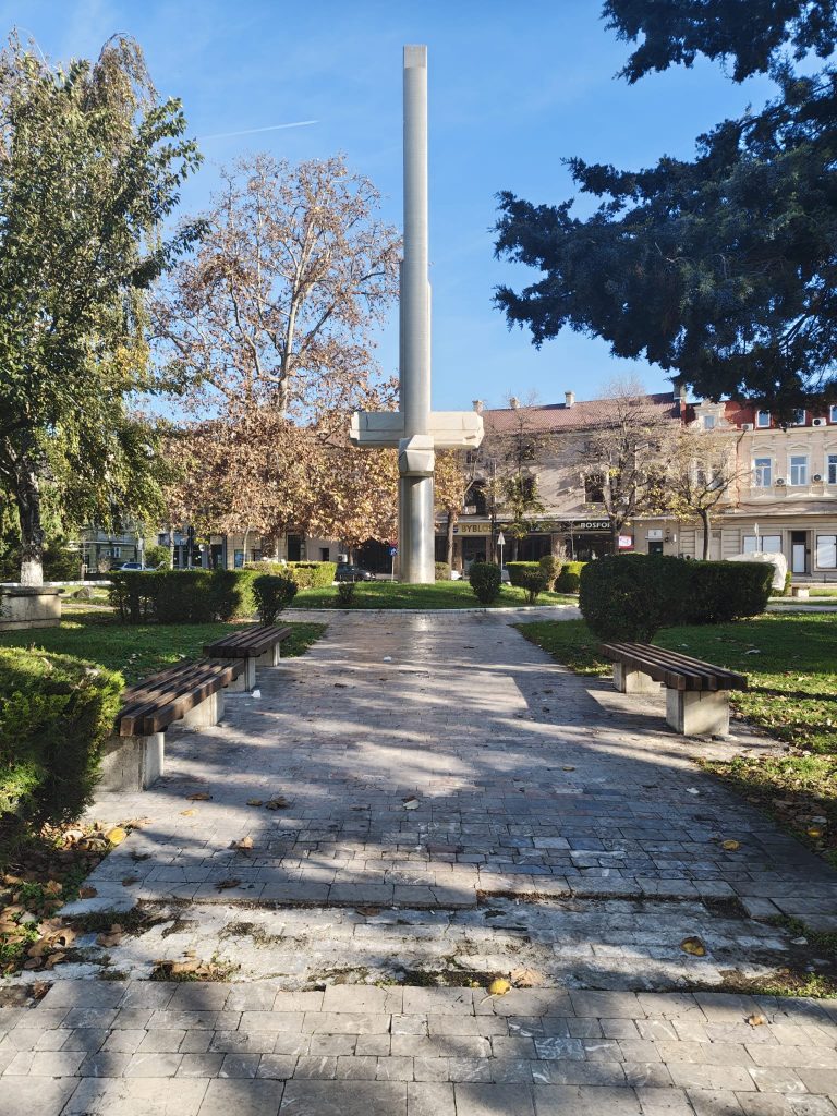Bravo ție Cristi, bravo vouă eroi anonimi ce țineți steagul sus! În semn de apreciere mă întorc să salut dar îmi pironesc privirea pe axa la capătul căruia străjuiește fălos monumentul de for public “Arc peste timp” al lui Wilhelm Demeter. Sunt la capătul drumului de 45 de minute și simt că nu mai rezist cu nervii.