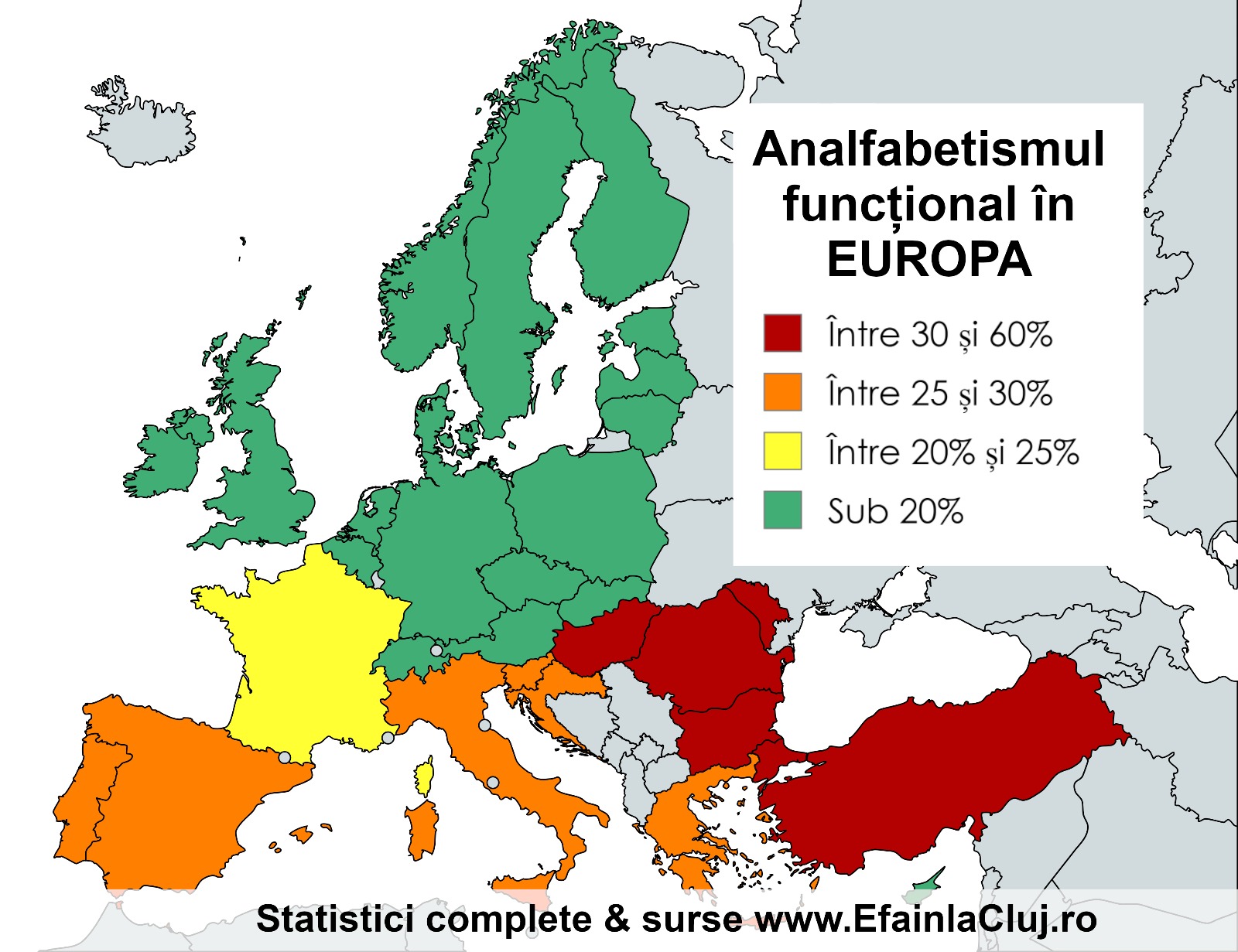 - În România, peste 50% dintre persoanele testate se află într-o formă de analfabetism funcțional. (G4Media.ro)
