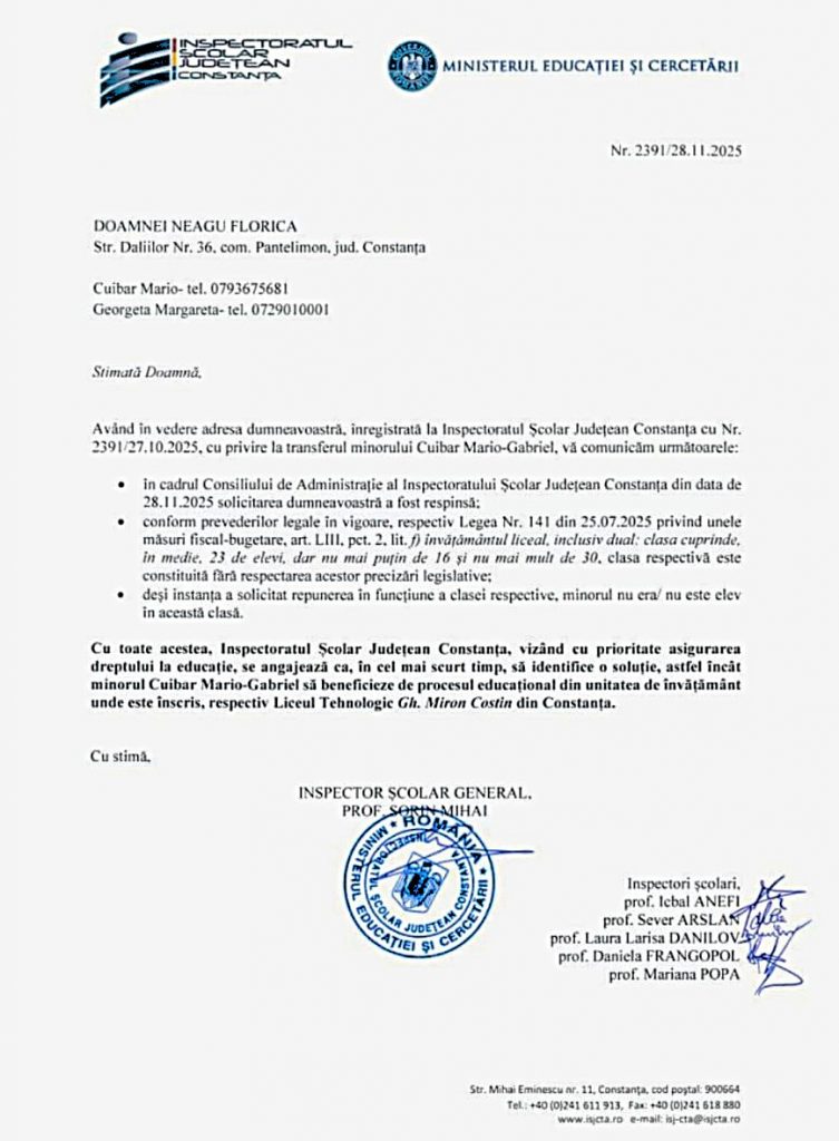 Cu toate acestea, IȘJ Constanța, vizând cu prioritate asigurarea dreptului la educație, se angajează ca, în cel mai scurt timp, să identifice o soluție, astfel încât minorul Cuibăr Mario-Gabriel să beneficieze de procesul educațional din unitatea de învățământ unde este înscris, respectiv Liceul Tehnologic Gh. Miron Costin din Constanța.»