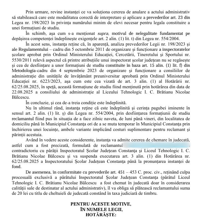 Instanța a reținut că nu se regăsește în atribuțiile unui inspectorat școlar județean și cea de desființare a unor formațiuni de studiu constituite în baza art. 15 alin. (1) lit. f) din Metodologia-cadru din 4 septembrie 2023. Aceste decizii revin exclusiv consiliilor de administrație din unitățile de învățământ preuniversitar, conform Ordinului Ministerului Educației nr. 6223/2023. În speță, formațiunea de studiu a fost constituită prin hotărârea din 22.08.2025 a consiliului de administrație al Liceului Tehnologic I. C. Brătianu Nicolae Bălcescu.