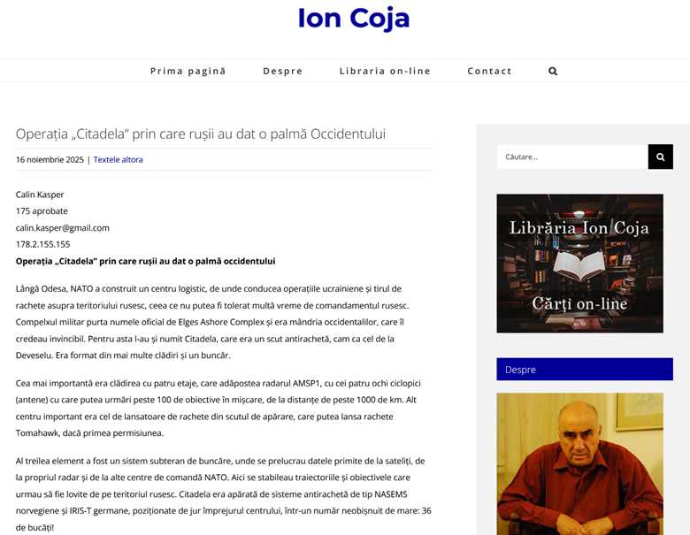 Trei zile mai târziu, același propagandistic “ou Fabergé” este scos la vânzare și pe taraba site-ului promoscovit SolidNews.ro, de data asta cu titlul: Cronica celor 15 minute în care rușii au distrus „Citadela”, centrul logistic de lângă Odesa de unde NATO coordona atacurile asupra Rusiei!” https://solidnews.ro/cronica-celor-15-minute-in-care-rusii-au-distrus-citadela-centrul-logistic-de-langa-odesa-de-unde-nato-coordona-atacurile-asupra-rusiei/. Este reproducerea integrală a textului cumpărat de Ion Coja, cu titlul ușor modificat sub semnătura aceluiaș impostor ce semnează cu nume le fantomei prietenoasă, Kasper.