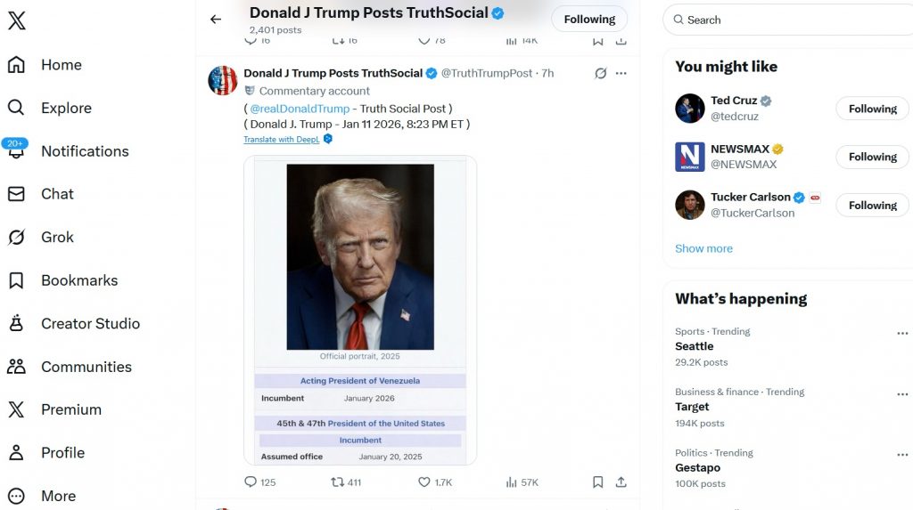 Duminică, 11 ianuarie, pe la ora 20,00, cel de-al 47-lea Președinte al SUA, Donald J. Trump, a decis să se maimuțărească pe conturile sale oficiale de pe Truth Social și X postându-și fotografia cu explicația “Președinte în exercițiu al Venezuelei”. Asta dacă nu cumva hackerii i-au piratat cele două conturi.
