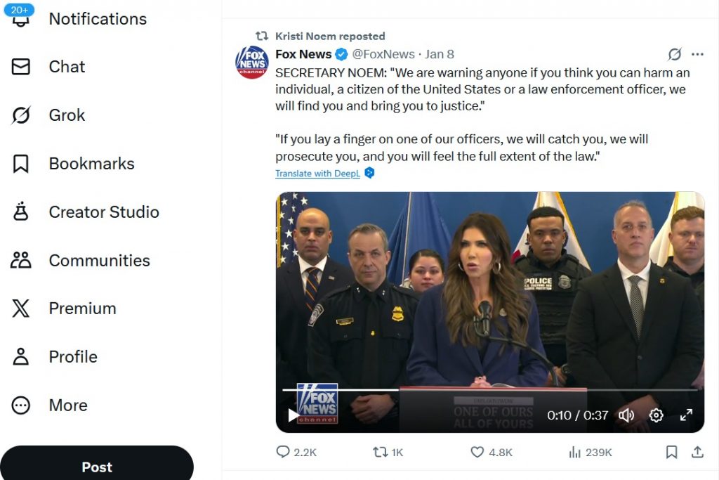 La rândul ei, Barbie de la Departamentul de Securitate Internă (DHS), Kristi Noem, secretar pentru afaceri interne ce conduce implementarea măsurilor anti-imigrație, a apărut pe 8 ianuarie, la o conferință ținută la One World Trade Center, în New York, cu sloganul „One of ours/ All of yours” pe pupitrul de la care vorbea. Evenimentul a avut loc a doua zi după uciderea poetei Renee Nicole Good de către agentul ICE, Jonathan Ross . Noem a vorbit despre un atac la adresa unor agenți ICE în urmă cu 6 luni, care ar fi dus la arestarea mai multor membri ai unei rețele de care ar fi aparținut atacatorii, și a criticat politicile de protecția a imigranților în așa zisele orașe sanctuar.