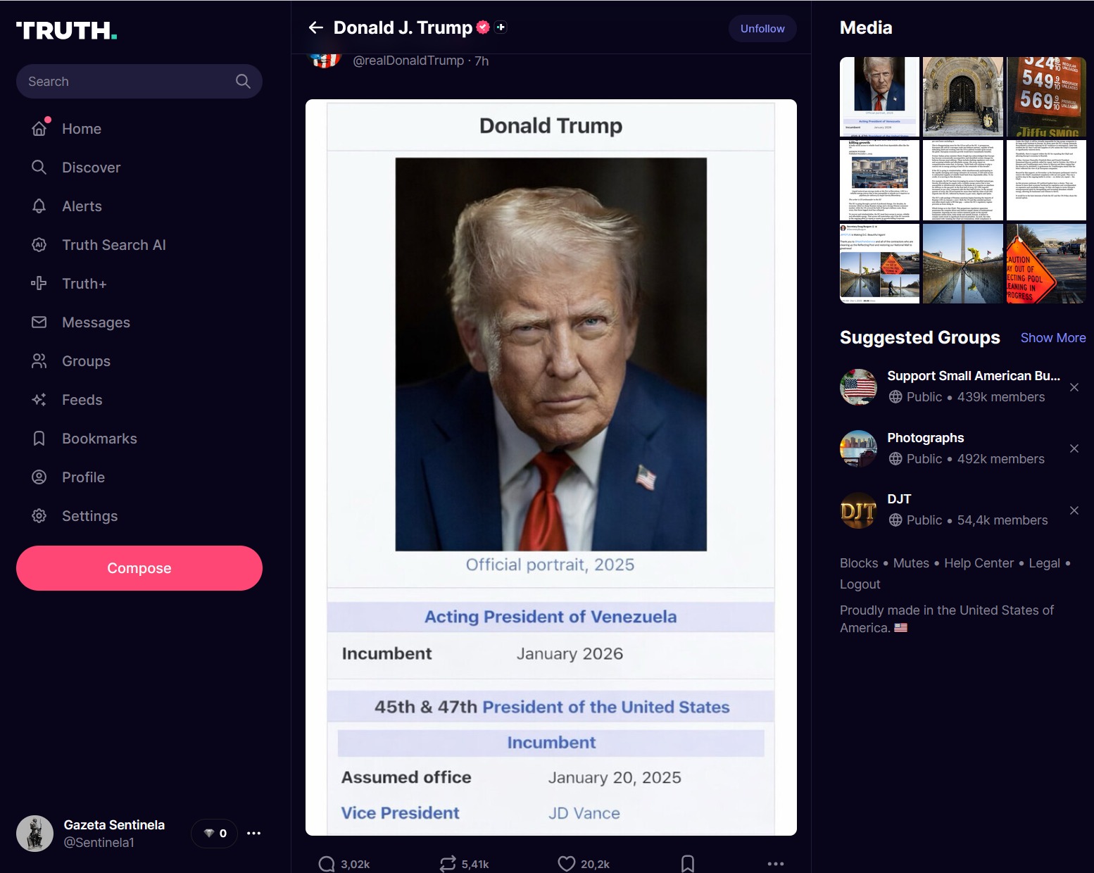 Duminică, 11 ianuarie, pe la ora 20,00, cel de-al 47-lea Președinte al SUA, Donald J. Trump, a decis să se maimuțărească pe conturile sale oficiale de pe Truth Social și X postându-și fotografia cu explicația “Președinte în exercițiu al Venezuelei”. Asta dacă nu cumva hackerii i-au piratat cele două conturi.