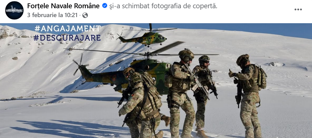O postare din 3 februarie, ce se dorește cu puternic impact emoțional, amestecă într-o fotografie panoramică un peisaj leit arctic trupe de desant, fie că sunt FOS sau infanterie marină debarcate din două Puma Naval, care asigură perimetrul pentru constituirea unui cap de pod. Pe fundal, stânga sus, două sloganuri motivaționale: #ANGAJAMENT/ #DESCURAJARE! Și asta-i tot. Pac, la războiu’!