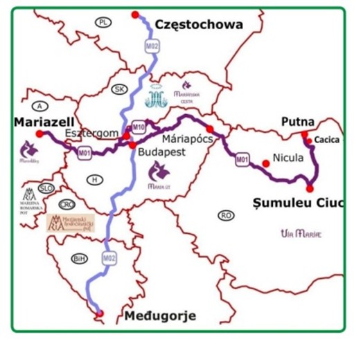 Spre deosebire de Santiago de Camino sau Via Francigena, asociate mai degrabă Europei de Vest, ruta pedestră Via Mariae, ce unește cu precădere, dar nu numai, obiectivele religioase ce au legătură cu Maica Domnului, este asociată de această dată Europei Centrale și de Est, un tărâm cunoscut pentru multiculturalismul și toleranța sa religioasă. Pornind inițial de la Mariazell, Austria, până la Șumuleu Ciuc în România, cu o lungime de 1.400 km pe relația vest-est și de la Czestochowa, Polonia, până la Medjugorje, în Bosnia-Herțegovina, pe relația nord-sud, Via Mariae descrie o cruce pe harta Europei. Începând cu 2021, pornind de la Șumuleu Ciuc, Via Mariae a fost extinsă pe raza județelor Neamț și Suceava, având ca punct terminus Mănăstirea Putna, legându-se așadar cu Via Transilvanica. Celebrele lăcașe de cult ortodox din cele două județe ale Moldovei au fost astfel conectate la această rută internațională de mari dimensiuni. (foto 1)