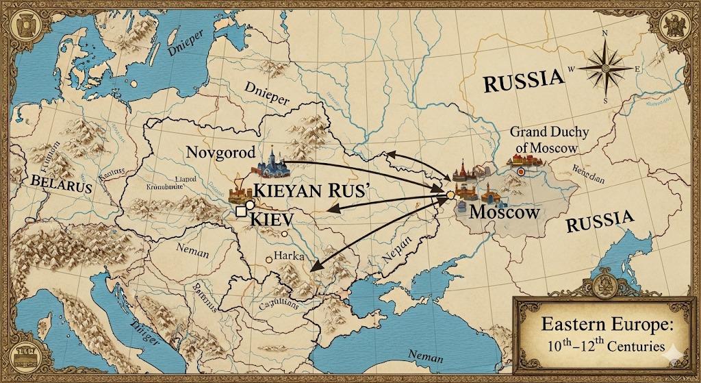 Chiar dacă orașul Moscova este menționat pentru prima dată abia în 1147, devine important ca centru politic abia după declinul statelor succesoare ale Rus’ Kieveană, cauzate de invazia mongolă. Cnezatul Moscovei, apărut în 1263, dincolo de așezarea geografică favorabilă și de multiplele legături comerciale, a avut șansa unor conducători capabili, hotărâți și nemiloși. Puterea și tradiția Rus’ Kievene au fost transmise treptat spre nord-est, pregătind ascensiunea Moscovei ca nucleu al viitoarei Rusii, prin intermediul conducătorilor aparținând liniei Rurikide.