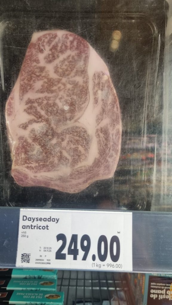 Am stat mult în fața vitrinei din sticlă securizată și am admirat-o pe îndelete fiind sigură că nu o să mai văd așa ceva… decât poate la Lidl, peste drum?! În fine eticheta descriptivă de pe rama casetei zicea “Dayseaday”, dar luându-mă după miniaturile din vecinătate și mai ales gugălind, am prins de veste că-i vorba despre niscaiva talent olandez, la mijloc. Mi-am zis să nu mă duc după fentă și să nu pic în plasa primei impresii căci așa că n-am jucat-o pe aia cu impresionismul flamand. Am mai stat, m-am mai uitat, am cugetat și mai ales am înghițit în sec și până la urmă mi-am zis: “Cu certitudine n-are nimic de-a face cu europenii. Sigur e operă de artă din școala Wagyu-Kobe, ce reflectă realismul nipon, după valoarea de adjudecare afișată 996 lei/kg”.