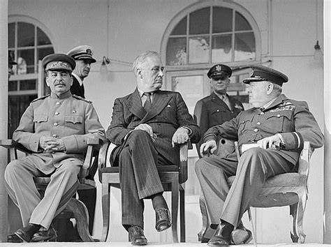 Întâlnirea celor Trei Mari a avut loc într-un moment decisiv al celui de-Al Doilea Război Mondial, când Aliații trec clar la ofensivă, iar înfrângerea Axei devine o chestiune de timp. După victoria de la Stalingrad din iarna 1943, a urmat o altă victorie sovietică decisivă, cea de la Kursk, astfel că Armata Roșie împingea armata germană spre vest, iar URSS devenise forța dominantă pe continent. Aliații au invadat Italia în 1943, Benito Mussolini fusese înlăturat în statul fantoșă intitulat ”Republica de la Salo”, dar luptele continuau, Germania rezistând puternic în peninsula. Pentru prima oară față în față, Stalin a cerut urgent deschiderea frontului din vest, Churchill preferă continuarea strategiei mediteraneene iar Roosevelt joacă rolul de mediator, astfel că neîncrederea între Vest și URSS începe deja să se contureze. La Teheran, în pofida celor discutate anterior de anglo-saxoni,  au avut loc Top of FormBottom of Formdiscuții preliminare despre împărțirea sferelor de influență, URSS urmând să aibă un rol dominant în Europa de Est. (foto 1)