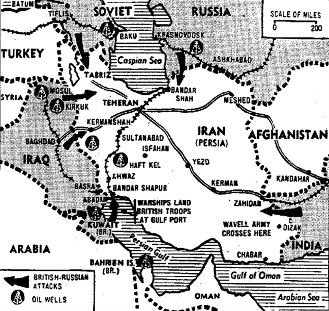 La câteva luni de la atacarea URSS, în august 1941, atunci când nemții ajunseseră la Leningrad, trecuseră de Smolensk și se apropiau de Kiev, când părea că totul urma să fie pierdut pentru sovietici, trei armate rusești au intrat în Iran. Obiectivele strategice ale invaziei erau multiple: să asigure liniile de aprovizionare ale Aliaților către URSS, să preia controlul asupra câmpurilor petroliere iraniene, să reducă influența Germaniei în Iran, unde Reza Shah Pahlavi folosea anterior sprijinul german pentru a echilibra influența britanicilor și sovieticilor  și să împiedice o potențială avansare a Axei din Turcia, prin Iran, spre importantele câmpuri petroliere de la Baku sau spre India britanică. (foto 2)