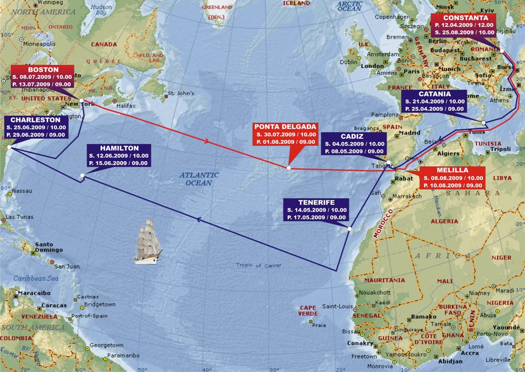Escalele vor fi făcute în porturile: Cagliari (Italia) – Las Palmas (Ile Canare/ Spania) – San Juan (Puerto Rico) – Miami (SUA) – Norfolk (SUA) – Baltimore (SUA/ Golful Chesapeake) – New York (SUA/ pe 4 iulie va fi prezentă la marea paradă navală de Ziua Independenței)- Boston (SUA/ va participa la regata „Five Sisters Cup” între New York și Boston, – Halifax ( Canada) – Ponta Delgada (Ile Azore/ Portugalia) – Lisabona (Portugalia) – Malaga (Spania – sărbătorirea a 140 de ani de relații diplomatice româno-spaniole) – Tunis (Tunisia) – Souda (Grecia) și Istanbul (Turcia).