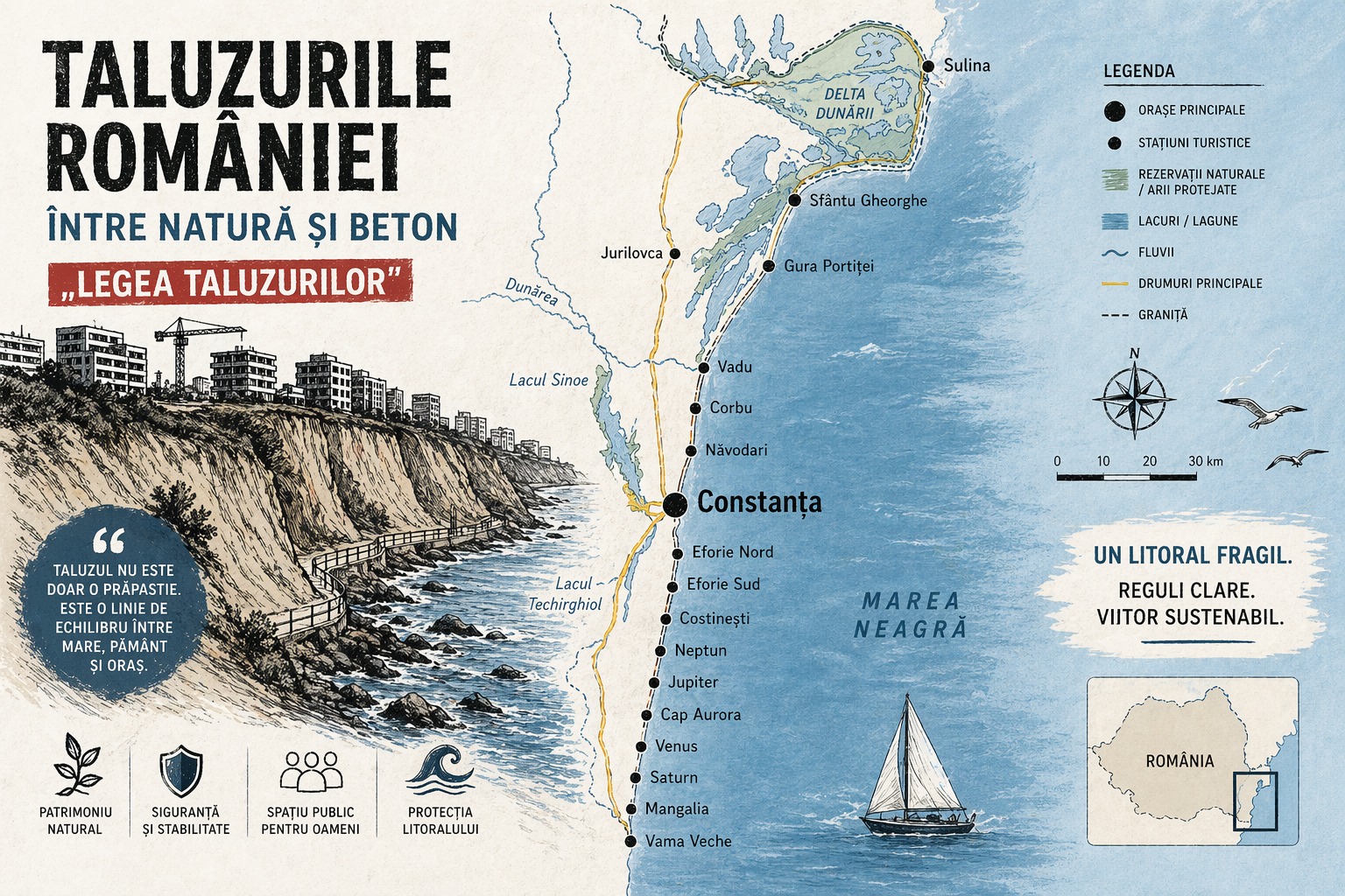 În acest context, o „lege a taluzurilor” este o necesitate practică. Aceasta ar trebui să definească explicit aceste zone, să stabilească limite clare de protecție și să introducă un control real, la nivel național, asupra ultimei rezerve valoroase a turismului litoral. Miza sa nu este doar urbanistică, ci felul în care societatea își gestionează resursele naturale limitate.